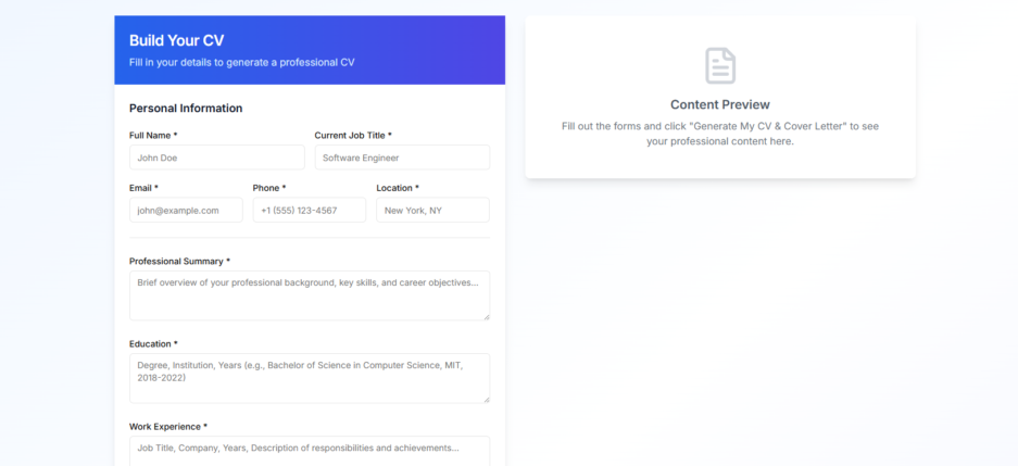 • Real-time preview of generated CV content