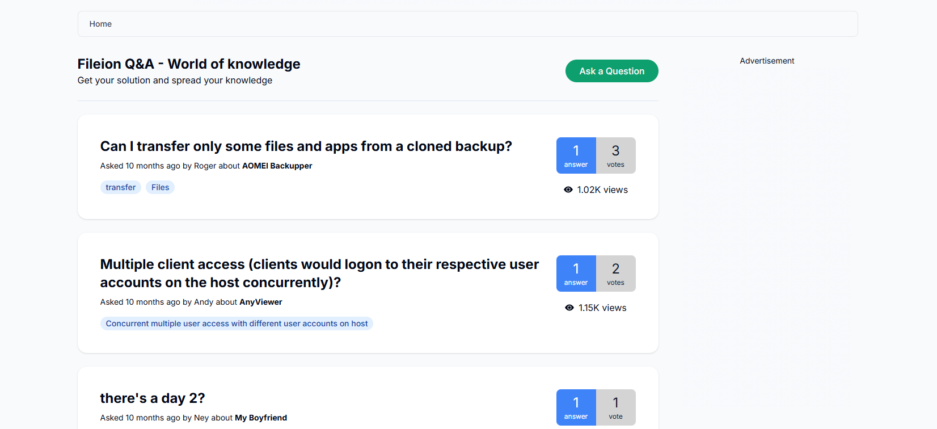 A real-time question and answer section focused on software usage, technical topics, and Fileion-related discussions, encouraging knowledge sharing and community engagement.