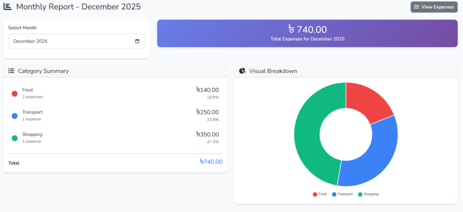 Monthly expense reports with category-wise breakdowns, filterable data by month, and visual charts to help users understand spending patterns.